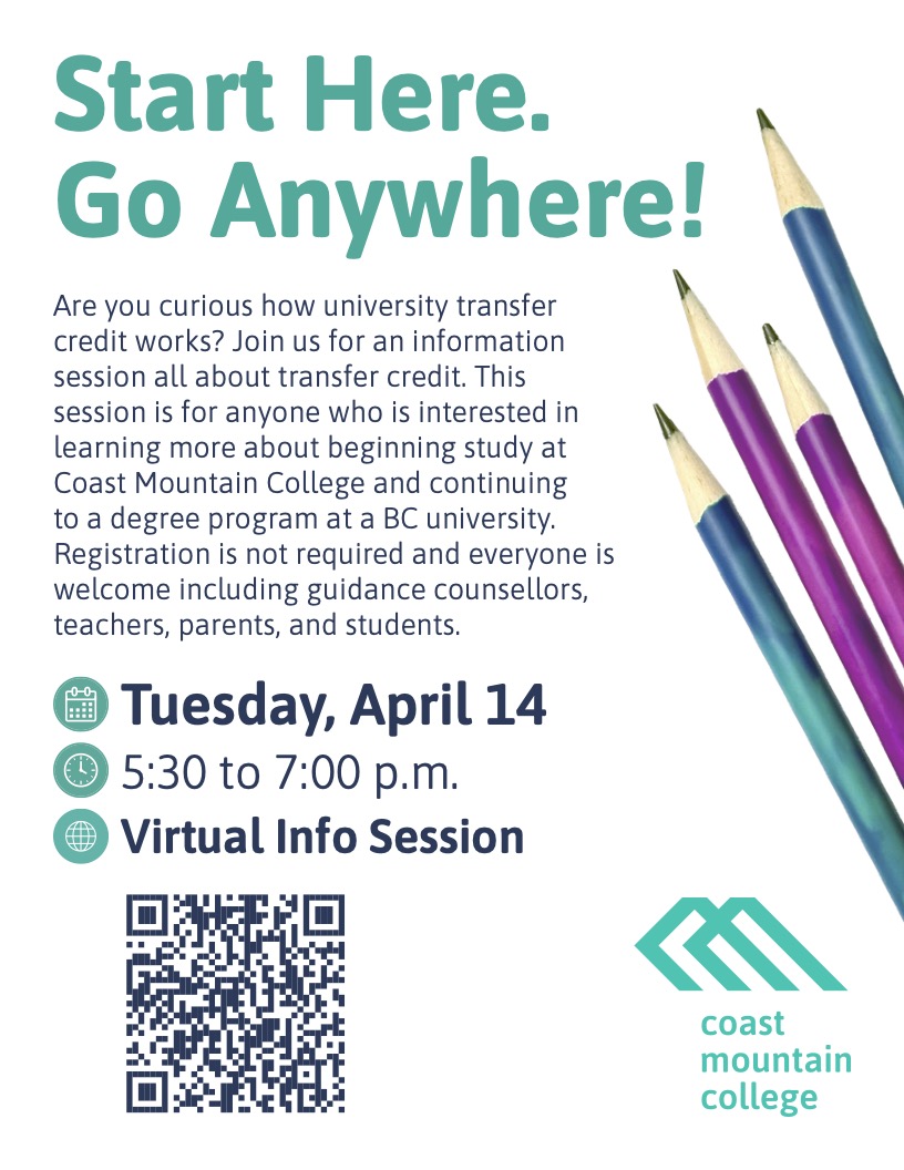 Are you curious how university transfer credit works? Join Coast Mountain College for a free information session all about transfer credit. This session is for anyone who is interested in learning more about beginning study at Coast Mountain College and continuing to a degree program at a BC university.